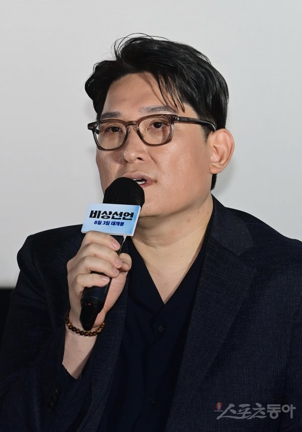 한재림 감독이 25일 서울 강남구 삼성동 메가박스 코엑스점에서 열린 영화 ‘비상선언’ 언론시사회에서 인사말을 하고 있다.