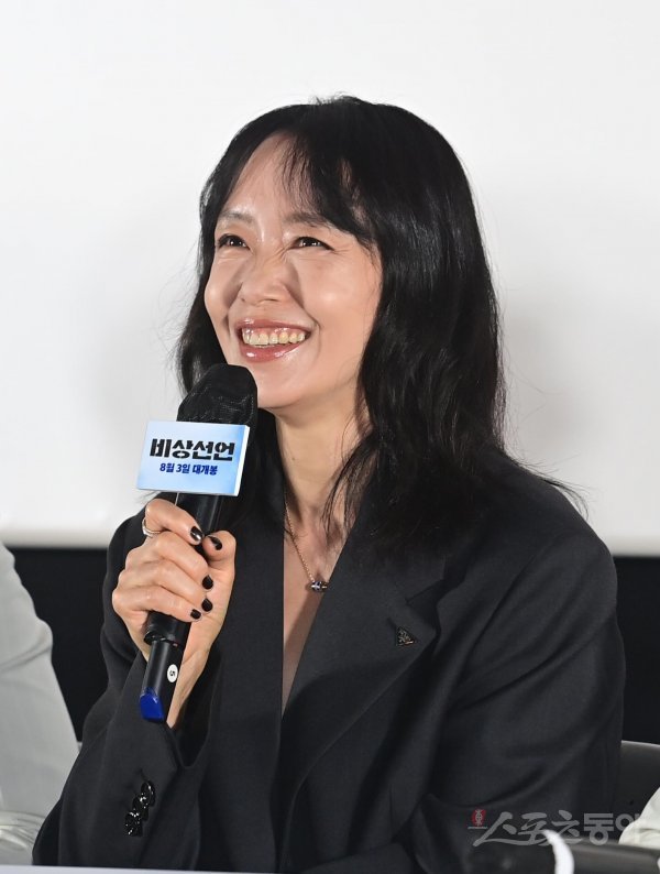 배우 전도연이 25일 서울 강남구 삼성동 메가박스 코엑스점에서 열린 영화 ‘비상선언’ 언론시사회에서 인사말을 하고 있다.