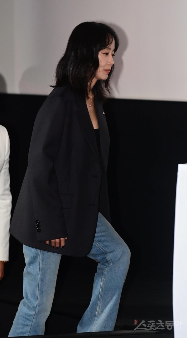 배우 전도연이 25일 서울 강남구 삼성동 메가박스 코엑스점에서 열린 영화 ‘비상선언’ 언론시사회 무대에 오르고 있다.
