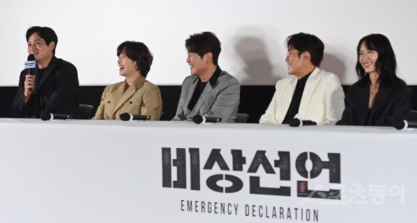 배우 박해준이 25일 서울 강남구 삼성동 메가박스 코엑스점에서 열린 영화 ‘비상선언’ 언론시사회에서 장난스러운 답변을 하고 있다.