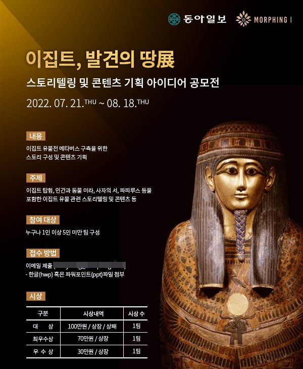 동아일보와 NFT 및 메타버스 솔루션 스타트업 모핑아이가 ‘이집트, 발견의 땅 展’ 전시와 관련해 공모전을 개최한다. 전시 위한 스토리텔링·콘텐츠 모집