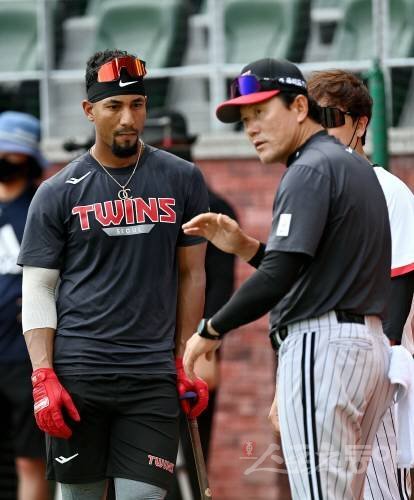 26일 인천 SSG 랜더스필드에서 ‘2022 신한은행 SOL KBO리그’ SSG 랜더스와 LG 트윈스의 경기가 열린다. 경기 전 LG 가르시아가 김민호 코치의 사인을 테스트하고 있다.