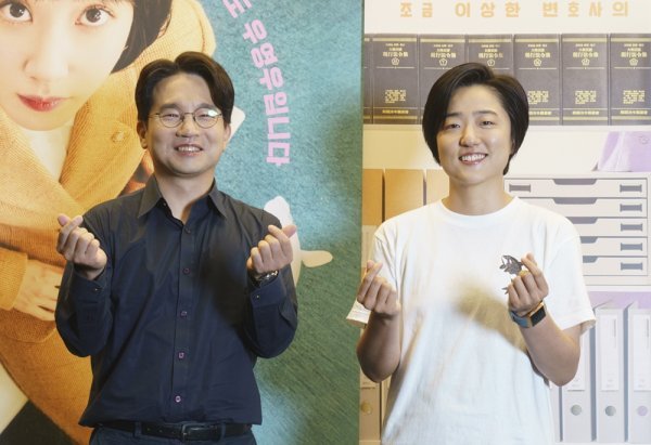 ENA 수목드라마 ‘이상한 변호사 우영우’의 연출자 유인식 PD와 문지원 작가(왼쪽부터)가 26일 서울시 마포구 스탠포드상암에서 열린 기자간담회 무대에 올라 손가락으로 하트 모양을 그리며 포즈를 취하고 있다. 사진제공|ENA