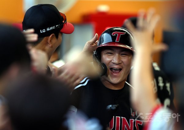 26일 인천 SSG 랜더스필드에서 ‘2022 신한은행 SOL KBO리그’ SSG 랜더스와 LG 트윈스의 경기가 열렸다. 3회초 무사 1루에서 LG 오지환이 투런 홈런을 쏘아 올린 후 동료들의 환영을 받고 있다.
