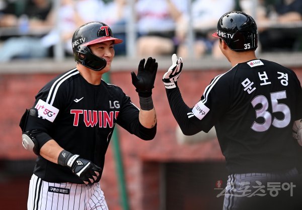 26일 인천 SSG 랜더스필드에서 ‘2022 신한은행 SOL KBO리그’ SSG 랜더스와 LG 트윈스의 경기가 열렸다. 2회초 무사에서 LG 오지환이 솔로 홈런을 쏘아 올린 후 동료와 기쁨을 나누고 있다.