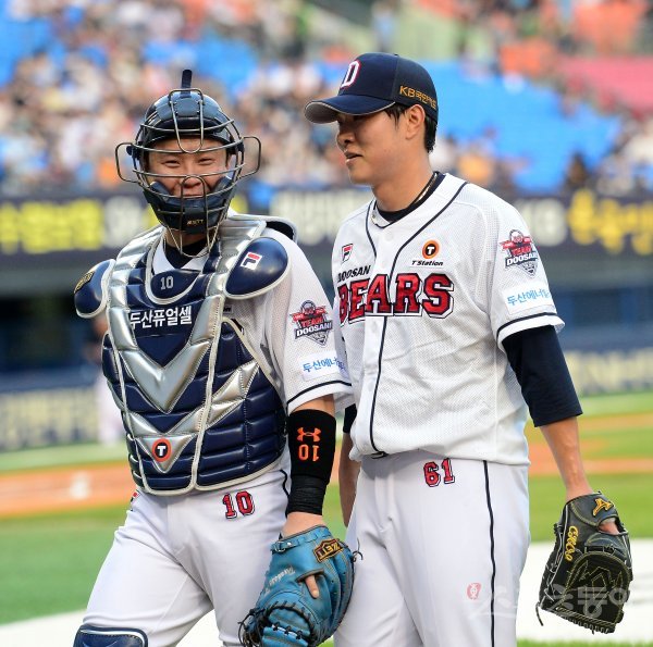 26일 서울 잠실야구장에서 ‘2022 신한은행 MY CAR KBO리그’ SSG 롯데 자이언츠와 두산 베어스 경기가 열렸다. 선발 투수로 등판한 두산 최원준이 1회초 투구를 마친 후 박세혁이 이야기를 하며 더그아웃으로 들어가고 있다.