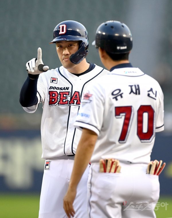 26일 서울 잠실야구장에서 ‘2022 신한은행 MY CAR KBO리그’ SSG 롯데 자이언츠와 두산 베어스 경기가 열렸다. 1회말 무사 1,2루 두산 양석환이 선제 1타점 적시타를 치고 1루에서 기뻐하고 있다.