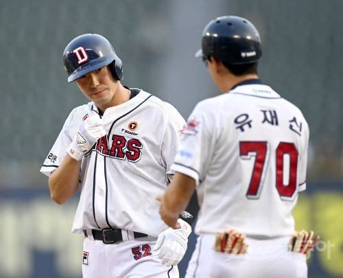 26일 서울 잠실야구장에서 ‘2022 신한은행 MY CAR KBO리그’ SSG 롯데 자이언츠와 두산 베어스 경기가 열렸다. 1회말 무사 만루 두산 김재호가 2타점 적시타를 치고 1루에서 기뻐하고 있다.