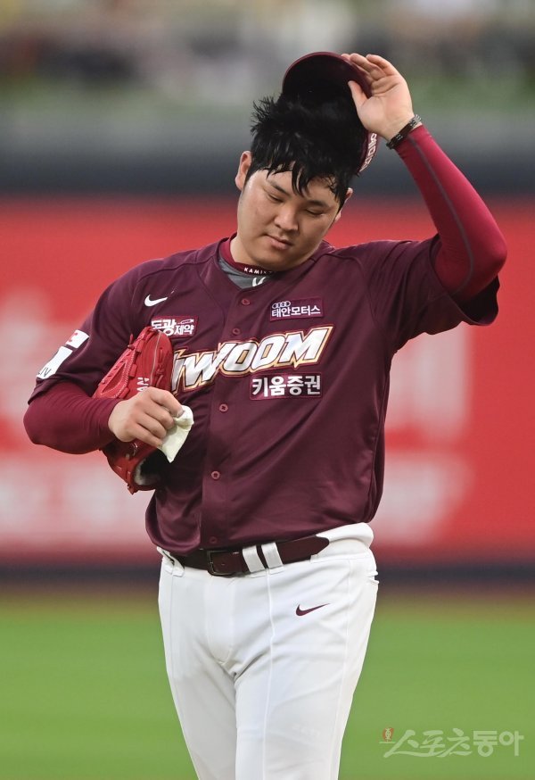 26일 경기도 수원KT위즈파크에서 열린 ‘2022 신한은행 SOL KBO리그’ KT 위즈와 키움 히어로즈의 경기에서 1회말 2실점으로 동점을 허용한 키움 한현희가 아쉬워하고 있다.