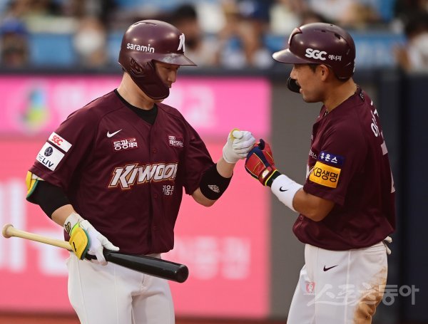 26일 경기도 수원KT위즈파크에서 열린 ‘2022 신한은행 SOL KBO리그’ KT 위즈와 키움 히어로즈의 경기에서 2회초 1사 키움 김준완이 우월 솔로 홈런을 친 후 동료와 주먹을 맞대고 있다.