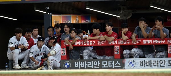 26일 인천 SSG 랜더스필드에서 ‘2022 신한은행 SOL KBO리그’ SSG 랜더스와 LG 트윈스의 경기가 열렸다. 0-9로 뒤진 SSG 9회말 마지막 공격 때 선수들이 경기를 지켜보고 있다.