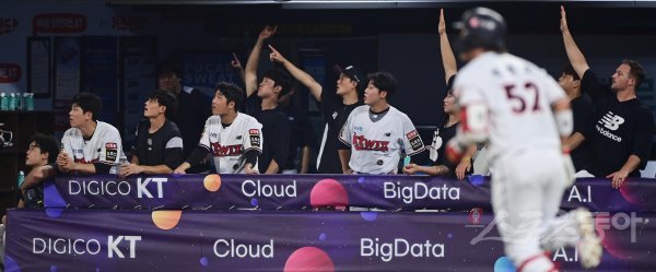 26일 경기도 수원KT위즈파크에서 열린 ‘2022 신한은행 SOL KBO리그’ KT 위즈와 키움 히어로즈의 경기에서 7회말 무사 KT 선수들이 더그아웃에서 박병호의 홈런 타구를 바라보고 있다.