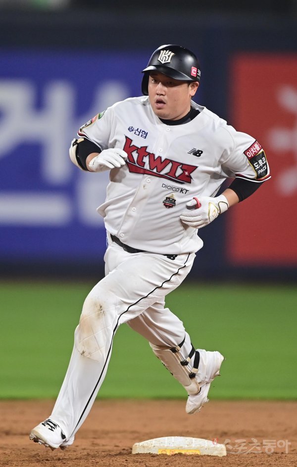 26일 경기도 수원KT위즈파크에서 열린 ‘2022 신한은행 SOL KBO리그’ KT 위즈와 키움 히어로즈의 경기에서 7회말 1사 KT 김준태가 역전 솔로 홈런을 친 후 그라운드를 돌고 있다.