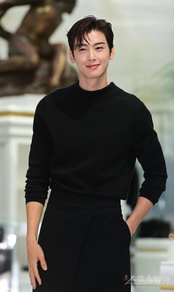 아스트로 차은우가 27일 서울 성동구 성수동 한 컨셉 스토어에서 열린 한 패션 브랜드의 남성 2022 겨울 컬렉션 스토어 오픈 기념 포토월에서 포즈를 취하고 있다.