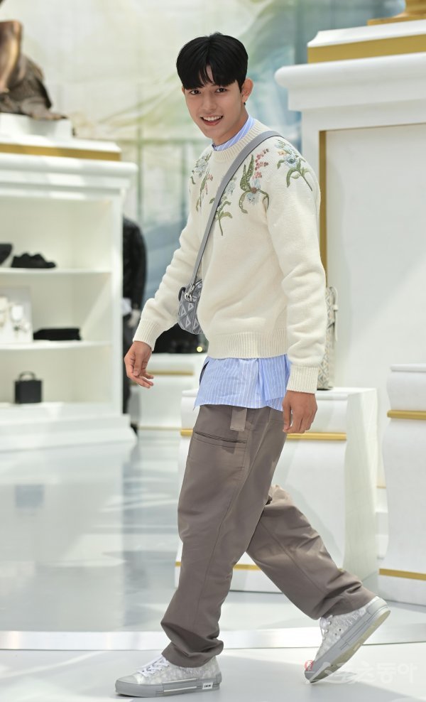 배우 로몬이 27일 서울 성동구 성수동 한 컨셉 스토어에서 열린 한 패션 브랜드의 남성 2022 겨울 컬렉션 스토어 오픈 기념 포토월에 입장하고 있다.
