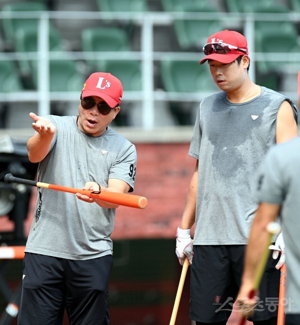 27일 인천 SSG 랜더스필드에서 ‘2022 신한은행 SOL KBO리그’ SSG 랜더스와 LG 트윈스의 경기가 열린다. 경기 전 SSG 전형도 코치가 오준혁에게 타격을 지도하고 있다.