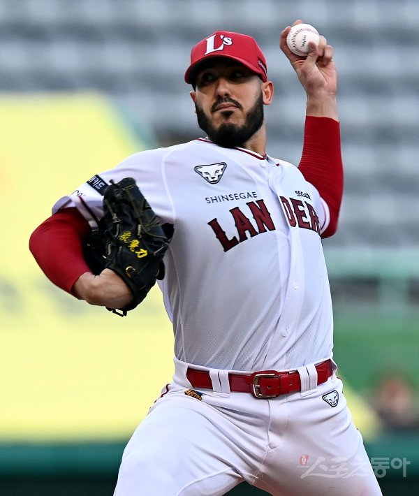 27일 인천 SSG 랜더스필드에서 ‘2022 신한은행 SOL KBO리그’ SSG 랜더스와 LG 트윈스의 경기가 열렸다. SSG 선발투수 모리만도가 힘차게 볼을 던지고 있다.