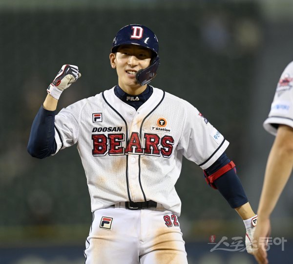 27일 서울 잠실야구장에서 ‘2022 신한은행 MY CAR KBO리그’ 롯데 자이언츠와 두산 베어스 경기가 열렸다. 5회말 무사 2,3루 두산 김태근이 1타점 적시타를 치고 1루에서 기뻐하고 있다.