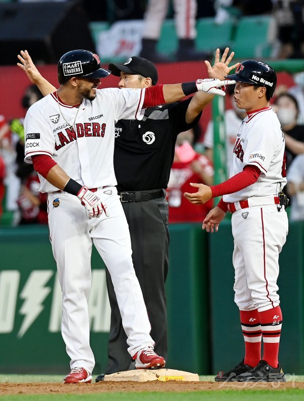 27일 인천 SSG 랜더스필드에서 ‘2022 신한은행 SOL KBO리그’ SSG 랜더스와 LG 트윈스의 경기가 열렸다. 5회말 1사에서 SSG 라가레스가 안타를 날린 후 세리머니를 펼치고 있다.
