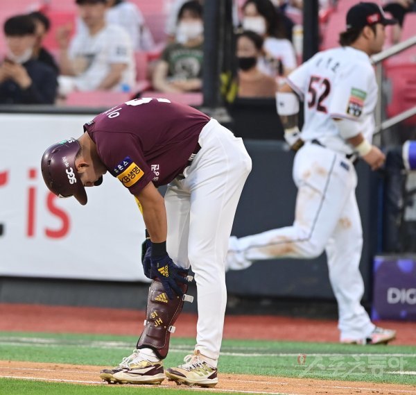 27일 경기도 수원KT위즈파크에서 열린 ‘2022 신한은행 SOL KBO리그’ KT 위즈와 키움 히어로즈의 경기에서 3회초 2사 1루 키움 이정후가 안타성 타구가 KT 1루수 박병호에게 잡힌 후 보호 장비를 벗고 있다.