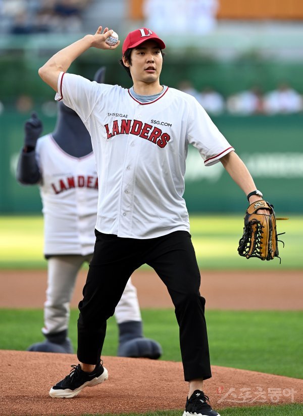 27일 인천 SSG 랜더스필드에서 ‘2022 신한은행 SOL KBO리그’ SSG 랜더스와 LG 트윈스의 경기가 열렸다. 경기 전 대한항공 조재영이 시구를 던지고 있다.