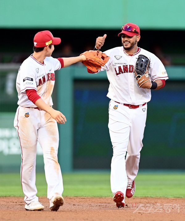 27일 인천 SSG 랜더스필드에서 ‘2022 신한은행 SOL KBO리그’ SSG 랜더스와 LG 트윈스의 경기가 열렸다. 3회초 2사 1, 2루에서 SSG 라가레스가 호수비를 펼친 후 동료와 기쁨을 나누고 있다.