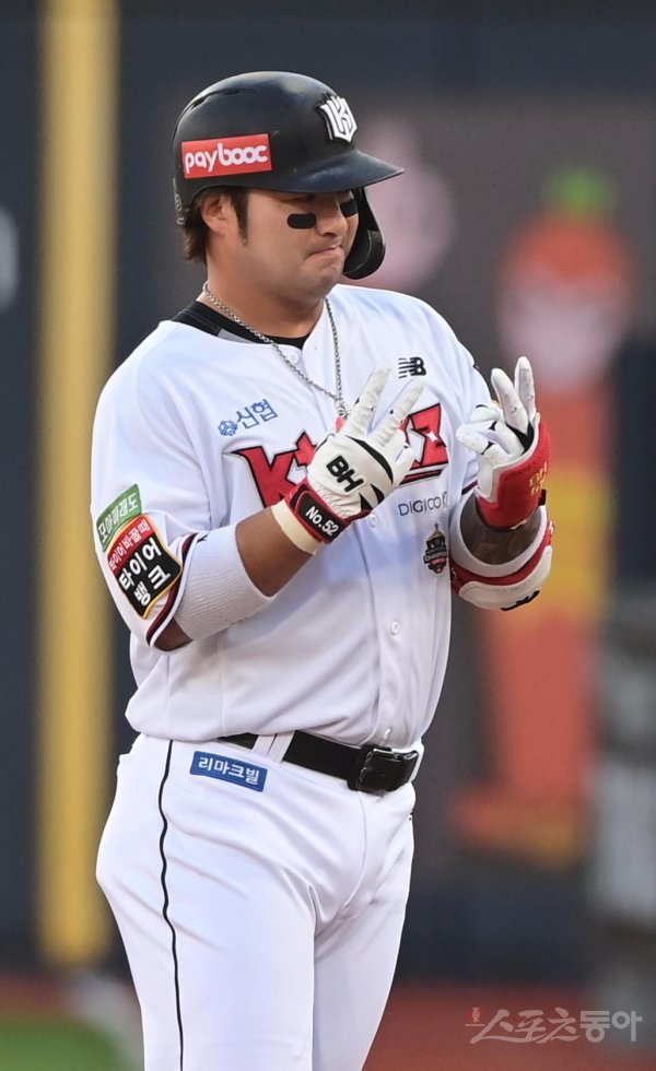 27일 경기도 수원KT위즈파크에서 열린 ‘2022 신한은행 SOL KBO리그’ KT 위즈와 키움 히어로즈의 경기에서 1회말 2사 1루 KT 박병호가 중전 안타를 친 후 세리머니를 하고 있다.