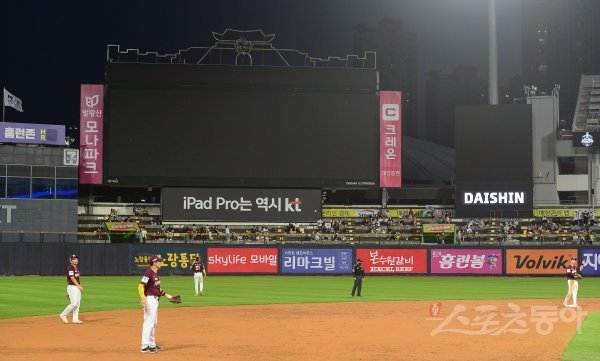 27일 경기도 수원KT위즈파크에서 열린 ‘2022 신한은행 SOL KBO리그’ KT 위즈와 키움 히어로즈의 경기에서 5회초 종료 후 전광판이 꺼져있다.