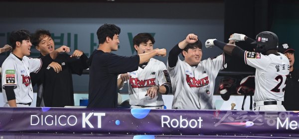 27일 경기도 수원KT위즈파크에서 열린 ‘2022 신한은행 SOL KBO리그’ KT 위즈와 키움 히어로즈의 경기에서 5회말 2사 3루 KT 알포드가 좌월 2점 홈런을 친 후 더그아웃에서 동료들과 세리머니를 하고 있다.