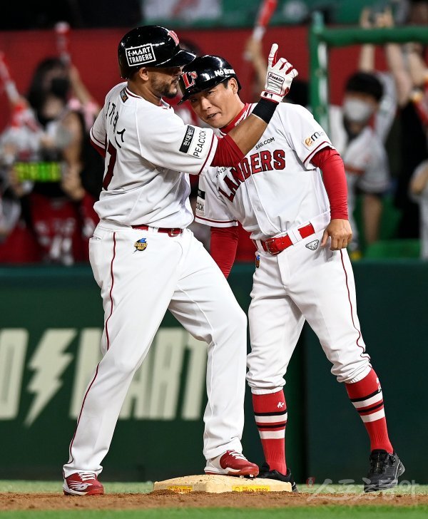 27일 인천 SSG 랜더스필드에서 ‘2022 신한은행 SOL KBO리그’ SSG 랜더스와 LG 트윈스의 경기가 열렸다. 6회말 2사 만루에서 SSG 라가레스가 2타점 적시타를 날린 후 세리머니를 펼치고 있다.
