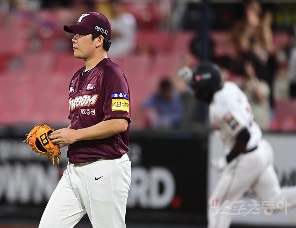 27일 경기도 수원KT위즈파크에서 열린 ‘2022 신한은행 SOL KBO리그’ KT 위즈와 키움 히어로즈의 경기에서 5회말 2사 3루 KT에 투런포를 허용한 정찬헌이 아쉬워하고 있다.