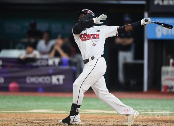 27일 경기도 수원KT위즈파크에서 열린 ‘2022 신한은행 SOL KBO리그’ KT 위즈와 키움 히어로즈의 경기에서 5회말 2사 3루 KT 알포드가 좌월 2점 홈런을 치고 있다.