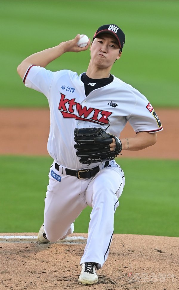 27일 경기도 수원KT위즈파크에서 열린 ‘2022 신한은행 SOL KBO리그’ KT 위즈와 키움 히어로즈의 경기에서 선발 투수로 마운드에 오른 KT 엄상백이 역투하고 있다.
