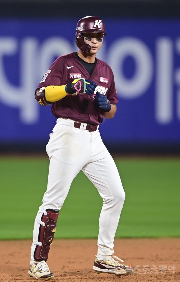 27일 경기도 수원KT위즈파크에서 열린 ‘2022 신한은행 SOL KBO리그’ KT 위즈와 키움 히어로즈의 경기에서 7회초 2사 1, 2루 키움 이정후가 역전 2타점 좌전 2루타를 친 후 더그아웃을 바라보고 있다.