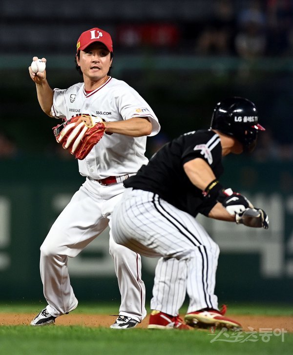 27일 인천 SSG 랜더스필드에서 ‘2022 신한은행 SOL KBO리그’ SSG 랜더스와 LG 트윈스의 경기가 열렸다. 8회초 무사 1, 2루에서 SSG 김성현이 1루 주자 문성주를 태그 아웃시키고 있다.