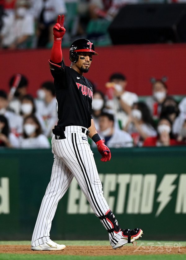 27일 인천 SSG 랜더스필드에서 ‘2022 신한은행 SOL KBO리그’ SSG 랜더스와 LG 트윈스의 경기가 열렸다. 8회초 1사 만루에서 LG 가르시아가 1타점 적시타를 날린 후 세리머니를 펼치고 있다.