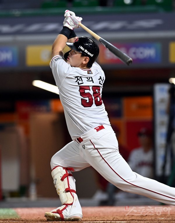 27일 인천 SSG 랜더스필드에서 ‘2022 신한은행 SOL KBO리그’ SSG 랜더스와 LG 트윈스의 경기가 열렸다. 8회말 무사 1루에서 SSG 전의산이 1타점 2루타를 날리고 있다.
