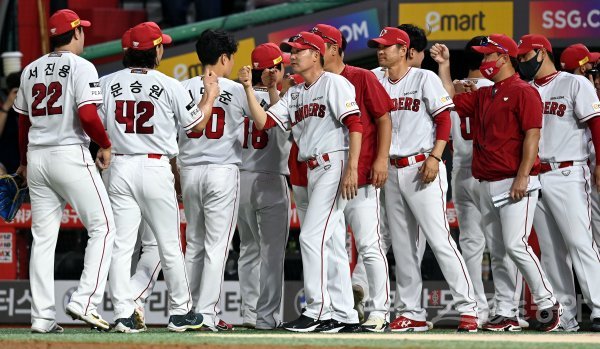 27일 인천 SSG 랜더스필드에서 ‘2022 신한은행 SOL KBO리그’ SSG 랜더스와 LG 트윈스의 경기가 열렸다. SSG가 LG를 상대로 6-3으로 승리한 후 김원형 감독이 선수들과 기쁨을 나누고 있다. 이날 승리로 SSG는 60승을 선착했다.