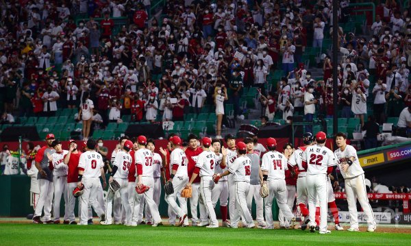 27일 인천 SSG 랜더스필드에서 ‘2022 신한은행 SOL KBO리그’ SSG 랜더스와 LG 트윈스의 경기가 열렸다. SSG가 LG를 상대로 6-3으로 승리한 후 선수들이 그라운드에서 기쁨을 나누고 있다. 이날 승리로 SSG는 60승을 선착했다.