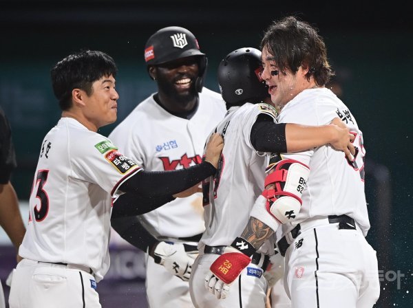 27일 경기도 수원KT위즈파크에서 열린 ‘2022 신한은행 SOL KBO리그’ KT 위즈와 키움 히어로즈의 경기에서 9회말 2사 1루 KT 박병호가 끝내기 중월 투런 홈런을 친 후 동료들과 기쁨을 나누고 있다.