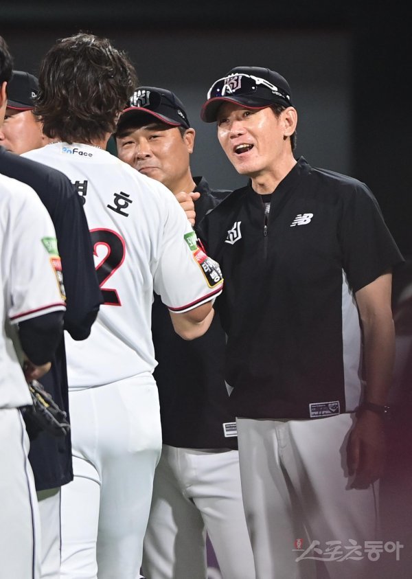 27일 경기도 수원KT위즈파크에서 열린 ‘2022 신한은행 SOL KBO리그’ KT 위즈와 키움 히어로즈의 경기에서 키움에 5-4로 승리를 거둔 KT 이강철 감독이 끝내기 투런포를 친 박병호를 축하하고 있다.