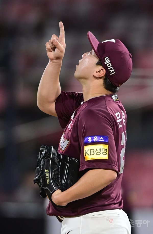 27일 경기도 수원KT위즈파크에서 열린 ‘2022 신한은행 SOL KBO리그’ KT 위즈와 키움 히어로즈의 경기에서 9회말 키움 문성현이 교체로 마운드에 오르며 하늘을 향해 손짓하고 있다.