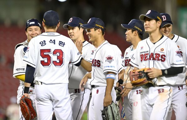27일 서울 잠실야구장에서 ‘2022 신한은행 MY CAR KBO리그’ 롯데 자이언츠와 두산 베어스 경기가 열렸다. 6-5 승리를 거두며 2연승을 달린 두산 선수들이 기뻐하고 있다.