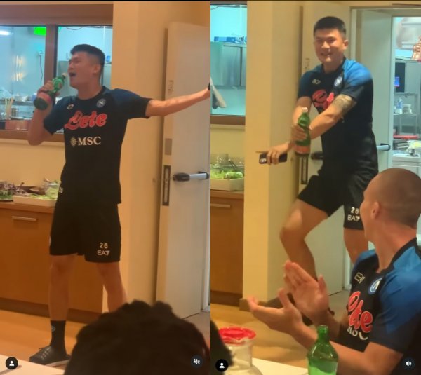 나폴리 구단은 28일(한국시간) 공식 인스타그램 계정에 김민재의 ‘공연 실황’ 영상을 게재했다. 김민재는 식당으로 여겨지는 곳에서 한 손에 든 음료 병을 마이크 삼아 열창한다. 다른 손으로 쥔 스마트 폰에서는 ‘강남 스타일’이 흘러나온다.