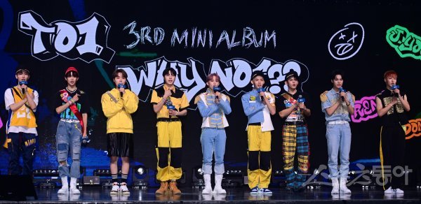 그룹 TO1이 28일 서울 광진구 광장동 예스24라이브홀에서 열린 세 번째 미니앨범 ‘WHY NOT??‘ 발매 기념 프레스 쇼케이스에서 인사말을 하고 있다.