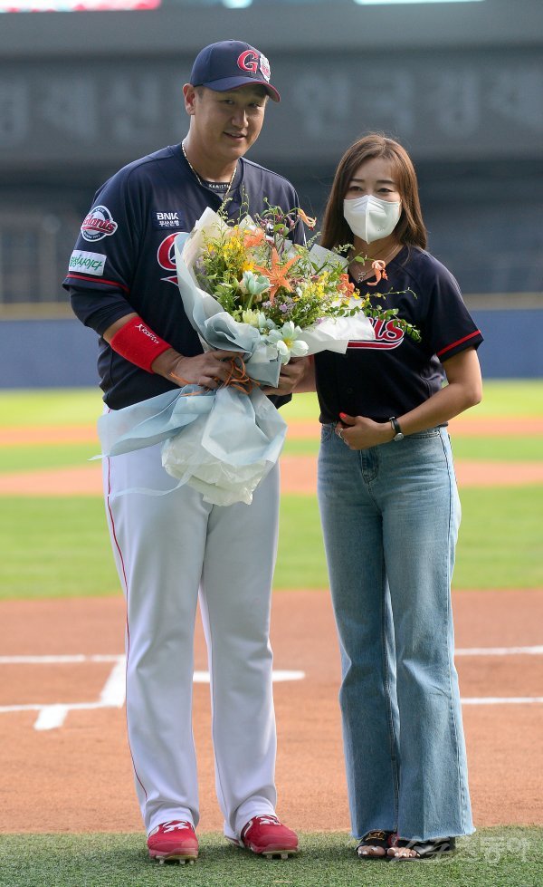 28일 서울 잠실야구장에서 ‘2022 신한은행 MY CAR KBO리그’ 롯데 자이언츠와 두산 베어스 경기가 열렸다. 경기 전 롯데 이대호가 구단별 은퇴 투어 행사에서 부인 신혜정 씨에게 꽃다발을 받고 있다.