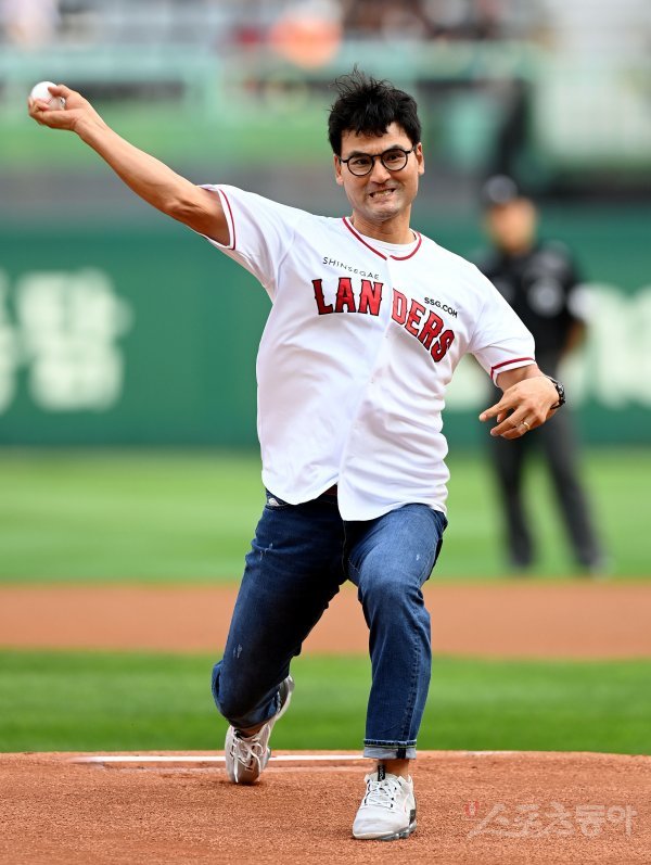 28일 인천 SSG 랜더스필드에서 ‘2022 신한은행 SOL KBO리그’ SSG 랜더스와 LG 트윈스의 경기가 열렸다. 경기에 앞서 박찬호가 던지고 있다.