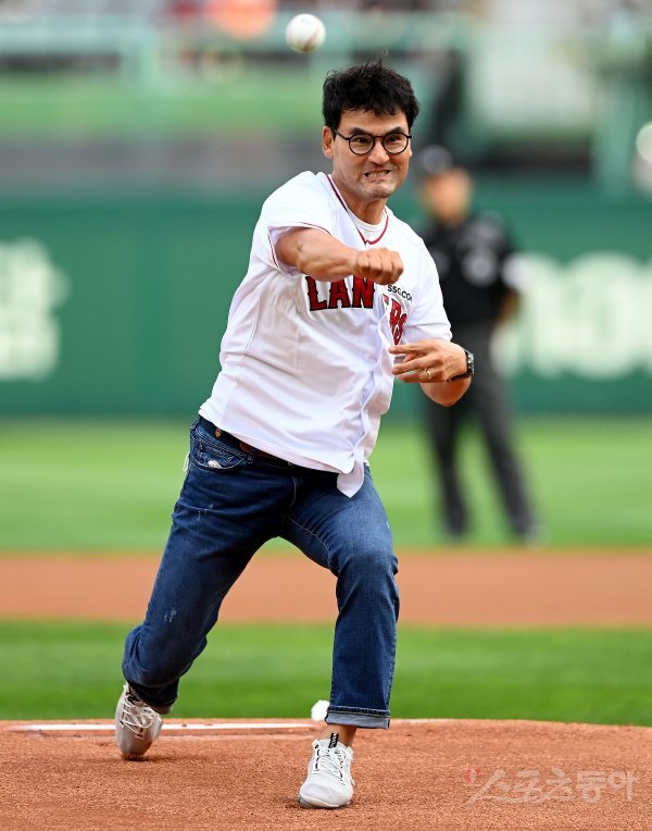 28일 인천 SSG 랜더스필드에서 ‘2022 신한은행 SOL KBO리그’ SSG 랜더스와 LG 트윈스의 경기가 열렸다. 경기에 앞서 박찬호가 던지고 있다.