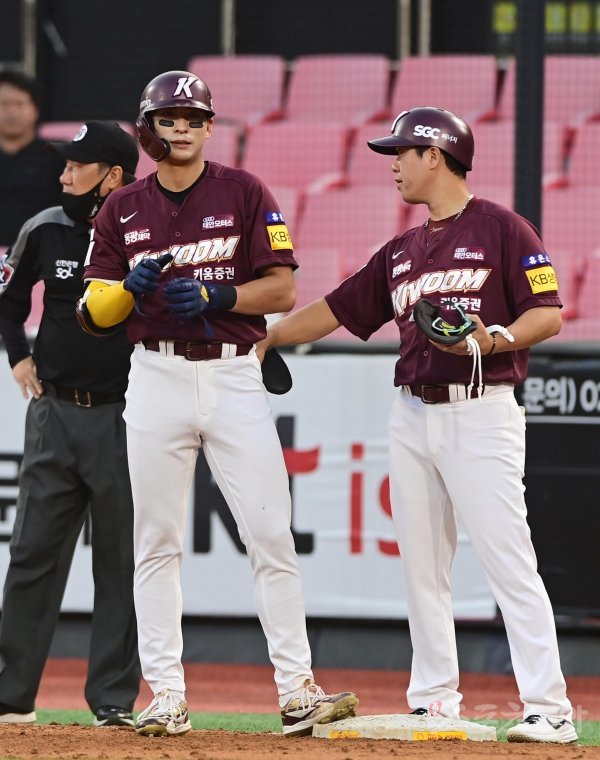 28일 경기도 수원KT위즈파크에서 열린 ‘2022 신한은행 SOL KBO리그’ KT 위즈와 키움 히어로즈의 경기에서 3회초 1사 키움 이정후가 우전 안타로 최소경기, 최연소 1000안타를 기록한 후 1루코치의 축하를 받고 있다.