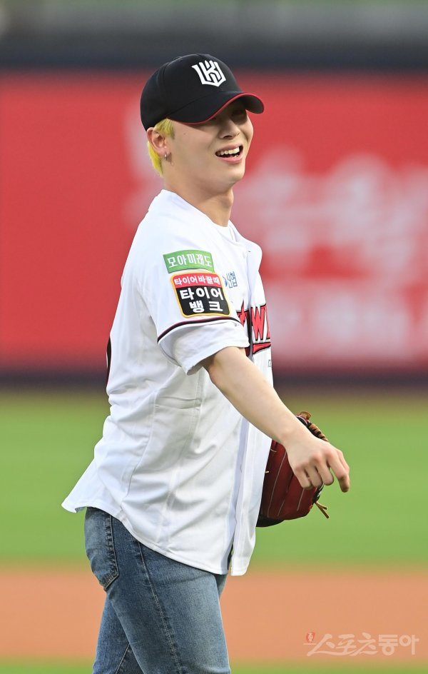 28일 경기도 수원KT위즈파크에서 열린 ‘2022 신한은행 SOL KBO리그’ KT 위즈와 키움 히어로즈의 경기에 앞서 그룹 블랭키 루이가 시구를 하고 있다.